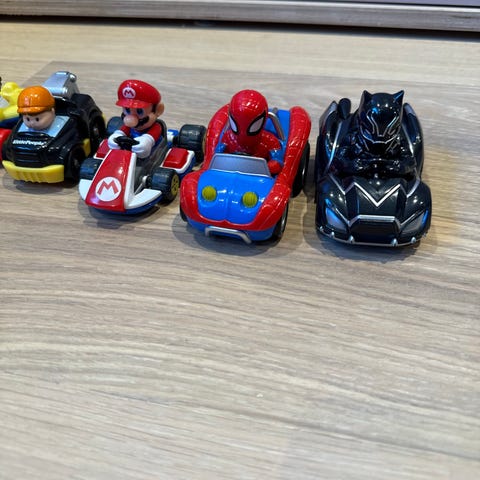 Kjøretøyene har runde former tilpasset små hender, og figurene kan plasseres i setene på de ulike kjøretøyene. Plastmateriale med tydelige farger. Passer til lek med Little People-tema som bygg og anlegg, utrykning og romfart.