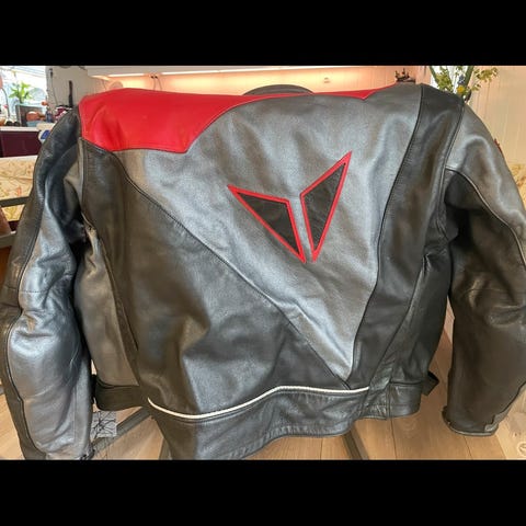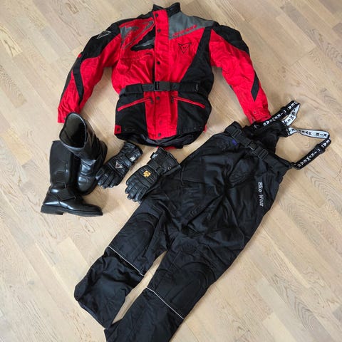 Dainese mc-jakke og bukse i skinn i svart med hvit skrift. Jakken har sportslig snitt med forsterkninger og polstring på skuldre og albuer. Innsiden har meshfôr for bedre ventilasjon. Glidelås foran og justeringsmuligheter i livet på buksen. Egnet som motorsykkeljakke og bukse til vei- og banekjøring.