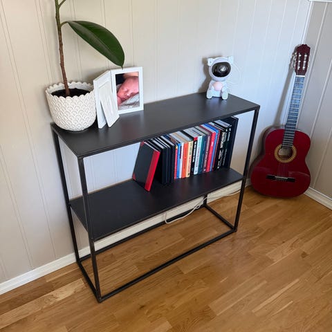Solid og stødig romdeler i sort mental sidetolper, og sorte hyller. Stått stille på et sted, siden montering. Kun vært til oppbevaring av lette ting. Står i 1.etg med adkomst rett ut. Kjøpt ny i 2025 for 999kr