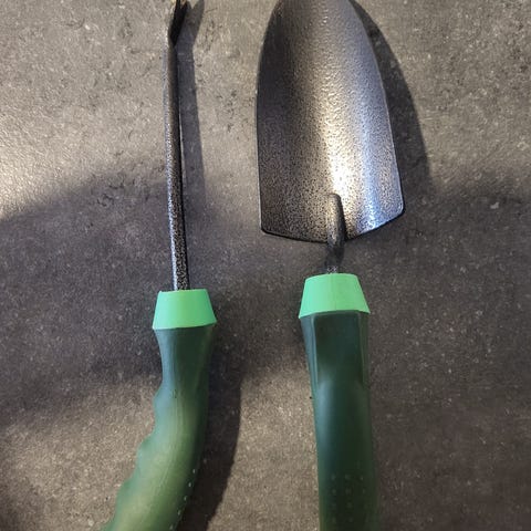 Håndredskaper til hagearbeid bestående av tre deler: en liten håndrive, en ugresskniv og en håndkultivator. Redskapene har grønne plasthåndtak med gult feste og metalldeler for arbeid i jord. Egnet til luking, rensing mellom planter og generell jordbearbeiding i bed, potter og mindre hageområder.