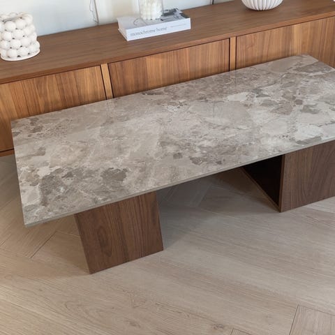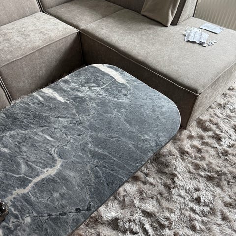 Selger dette nesten nye sofabordet da det ikke passet inn i leiligheten som tenkt. Består av bein i mørk eik/valnøtt og en porselensflis i lyst marmor design. Kan hentes i 5 etg på Frogner.