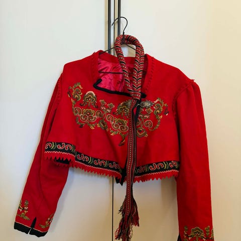 Vurderer å selge min jakke da jeg har sjal som jeg bruker. Jakken har sølvspenne som følger med . Nyrenset) jeg har aldri brukt jakken for den har vært for stor til meg. Da jeg kjøpte den ble jeg fortalt at den ble brodert 1997-1999. Jeg mener at denne jakken kan passe størrelse 38-42