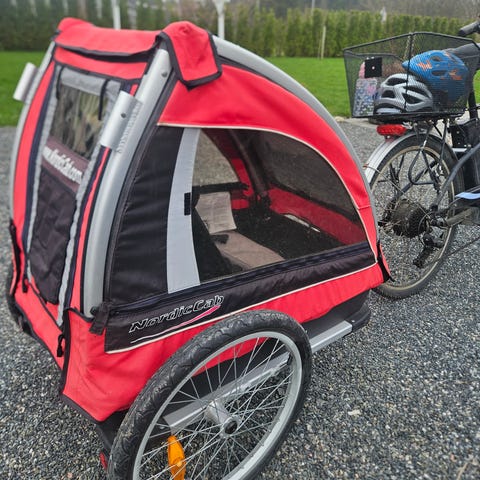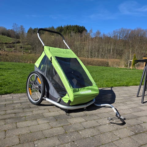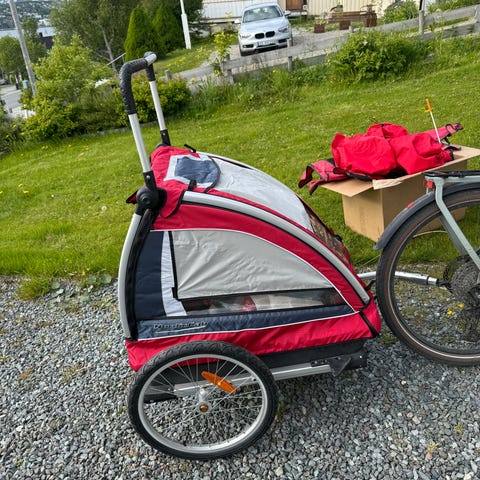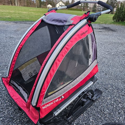 Sykkelvogn/barnevogn/multisportvogn med plass til to barn. Vognen har polstrede seter med hodestøtter og justerbare seler. Fronten har gjennomsiktig vindu med glidelås. Det følger med stort hjul for joggemodus, mindre svingbart hjul til gåmodus, drag for bruk som sykkelvogn samt ski og pulkdrag for pulk / skivogn. Kan også brukes som varevogn eller turvogn som produsenten teller som 2 funksjoner til. Egner seg til transport av barn på tur, sykling, jogging og skiturer, avhengig av hvilket utstyr som monteres.