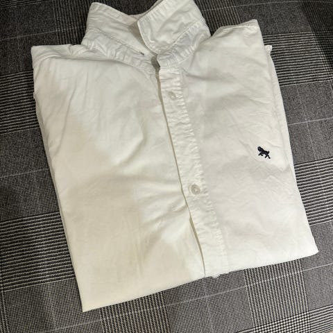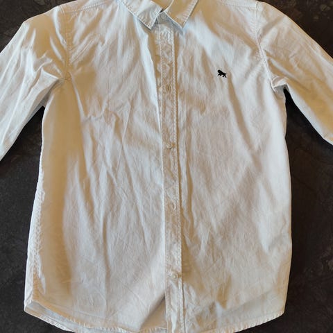 H&M skjorte for gutt i størrelse 146. Skjorten er hvit med krage, lange ermer og knappelukking foran. Den har brystlomme på venstre side. Passer til både hverdag og mer formelle anledninger.