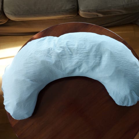 Sebra ammepute i lys blå farge med motiv av kjøretøy og trafikkskilt. Puten har buet fasong som gir støtte rundt kroppen ved amming eller mating av baby. Tekstilet har trykk med biler, busser, lastebiler og andre kjøretøy. Leveres med tilhørende stoffpose/trekk med samme mønster og bærehåndtak for oppbevaring eller transport. Egnet til bruk i sofa, stol eller seng ved amming eller flaskemating.