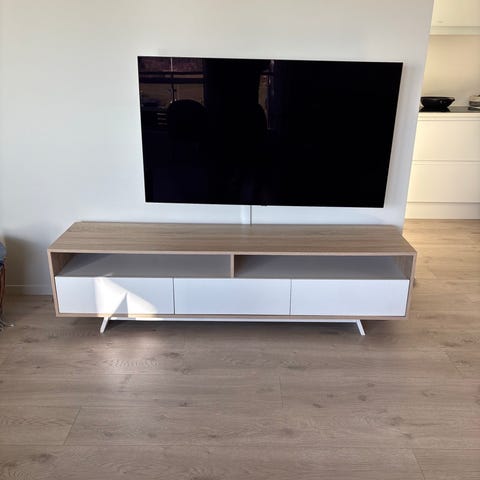 IKEA TV-benk i høyglans hvit utførelse med topplate i tre (hobbyplate). Møbelet har åpne hyller og lukkede skuffer i front som gir plass til TV-utstyr, bøker og annet tilbehør. Topplaten i tre har gjennomføring for kabler bak, som gjør det enklere å samle og skjule ledninger. Egnet som TV-møbel eller lav oppbevaringsbenk i stue eller mediehjørne. TV-benken kommer naturlig med en glassplate i frostet glass, som jeg i dag har under treplaten. Denne er limt fast med to-sidig teip som en del av monteringsveiledningen til IKEA.