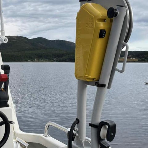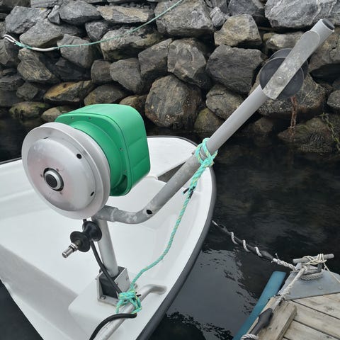 Hobbyfisher Hobby Line E teinehaler med elektrisk drift. Enheten har grønt motordeksel og sølvfarget trommel for innhenting av line eller teiner. Monteres på festeanordning, og leveres med strømkabel og tilkoblingskontakter.