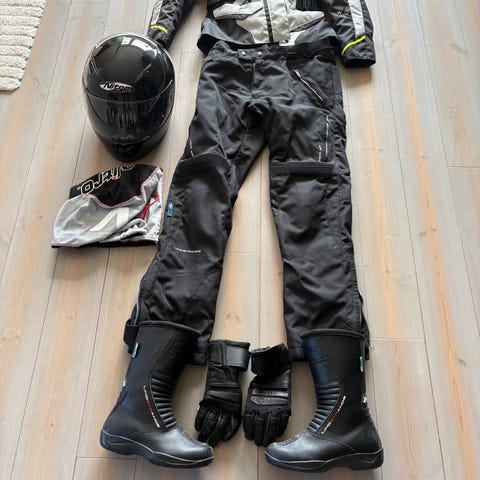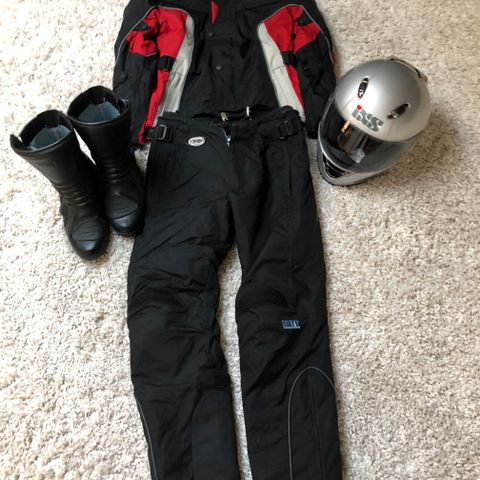 Settet er egnet som komplett motorsykkelutrustning til dame, med ulike størrelser på de enkelte delene: jakke 36, bukse 42, hansker S/7 og støvler 37.