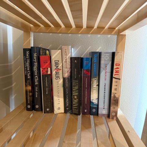 Pakke med 9 kriminalromaner av Kim Småge. Bøkene på bildet inkluderer blant annet titler som «Lex Love», «Containerkvinnene», «Solefall», «Nattdykk», «Sub Rosa», «Kvinnen i den lille båten», «En kjernesunn død» og «Kainan». Dette er innbundne bøker i norsk språk. En bok har slitt omslag. Kan hentes.