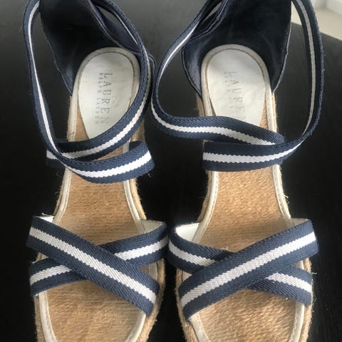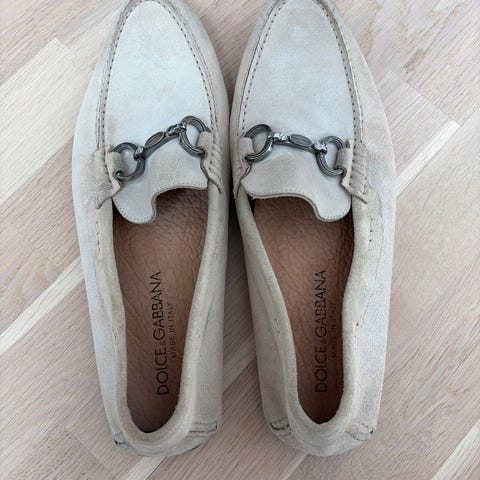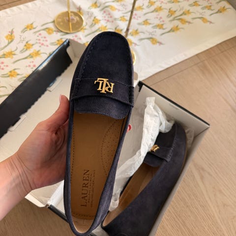Ralph Lauren mokkasiner/båtsko i størrelse 41, men de tilsvarer mer 39/40. Skoene er i beige skinn med RL-logo på overdelen. Myk og fleksibel yttersåle med gummipartier for bedre grep. Klassisk mokkasinfasong som passer til hverdagsbruk og lett penbruk. Egner seg godt til bruk vår, sommer og tidlig høst.