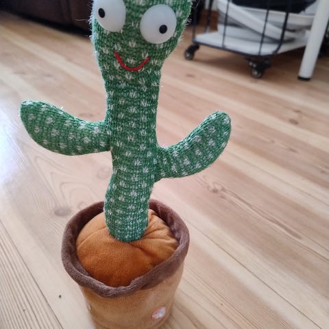 Elektronisk dansende kaktus leke i grønn tekstil med mønster. Figuren står i en potteformet base i tekstil og har påsydd gul hatt og lite skjerf. Leken har innebygd elektronikk i bunnen med av/på-bryter og knapper, samt tilkobling for medfølgende USB-ladekabel. Egnet som underholdningsleke og dekorasjon innendørs. Brukes sammen med USB-strømkilde etter produsentens anvisninger.