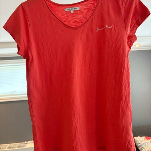 Jean Paul T-skjorte for dame i størrelse XS. T-skjorten er rosa og laget av bomull. Den har V-hals, korte ermer og liten Jean Paul-logo på brystet. Passer til hverdagsbruk alene eller under genser eller jakke.