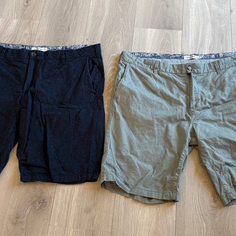 2 stk Jack & Jones shorts for herre i størrelse S. Shortsene er i bomull i fargene beige og grå/blå. Klassisk modell med beltehemper, knapp og glidelåslukking foran. Praktiske sidelommer og baklommer. Egnet til hverdagsbruk i varme perioder.