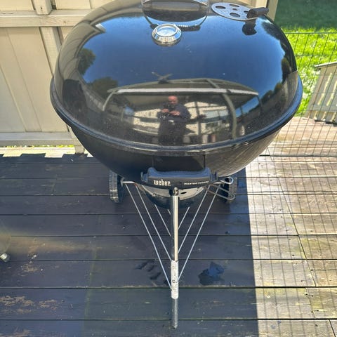 Grillen har rund grillrist i metall og lokk med luftventil på toppen for regulering av trekk.