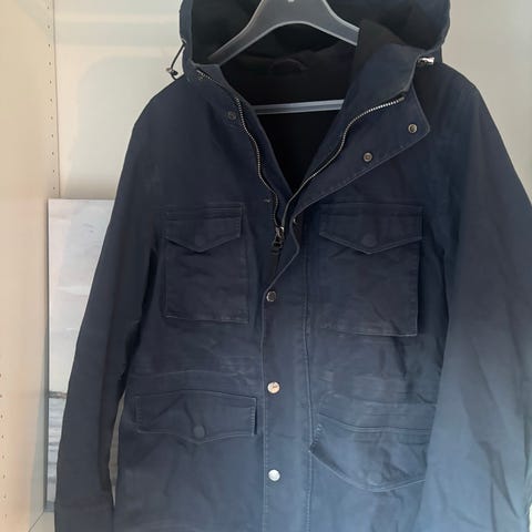 Hackett, London, navyblå jakke med fire ytterlommer, regulerbar i midjen, justerbare knapper på ermet, hette i kragen, shower restitant, str. XL.