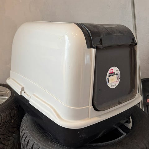 • Kattedoen er ny, kjøpt 21. mars hos Musti (300kr) - en lukket toalettboks for katt med toppinngang og perforert lokk som reduserer spredning av sand. Følger også 5 store plastposer som passer perfekt i størrelse