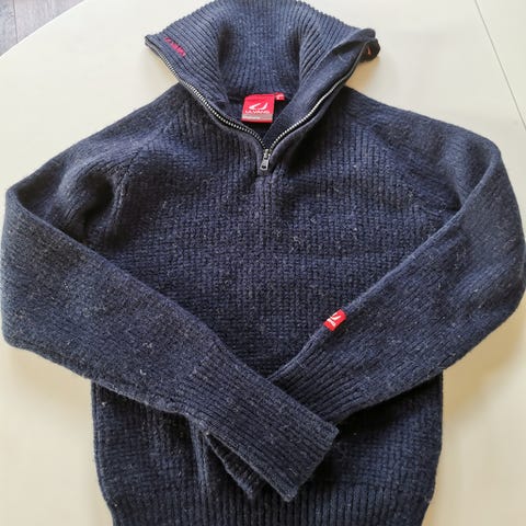Ullgenser i 100 % ull med flettemønster foran og slett bak. Hull til tommel på armene og zip i halsen.