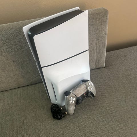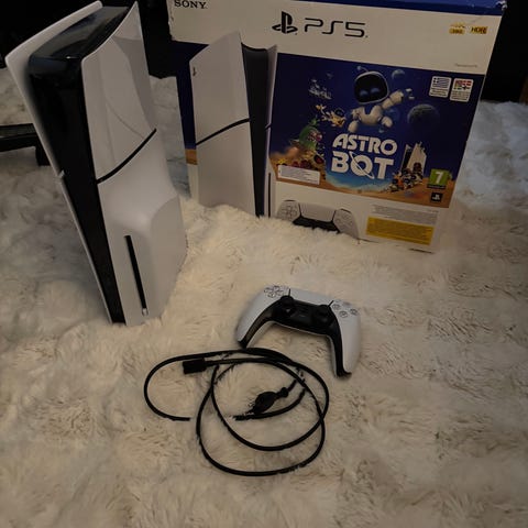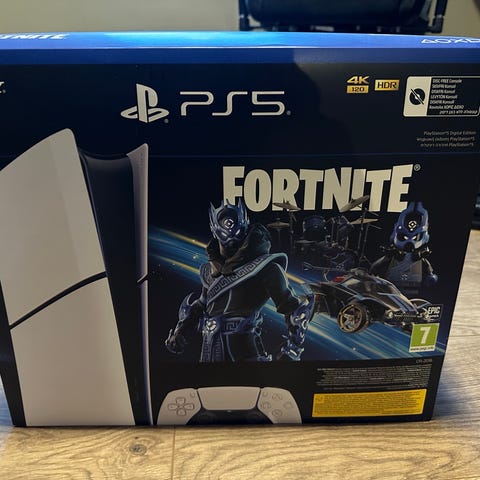 Sony PS 5 Slim Standard Fortnite Edition + Fortnite-kontroller og alle nødvendige kabler. Konsollen er helt ny og ubrukt, mottatt etter en reklamasjon i mars 2026.