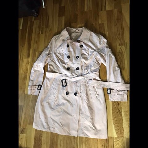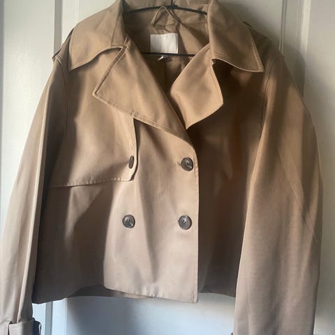Va Vite trenchcoat for dame i størrelse 42, kjøpt på Vic. Jakken er beige og har dobbeltspent knepping med mørke knapper, klassisk krage og sidelommer. Passer som ytterjakke i overgangssesonger og til hverdagsbruk.