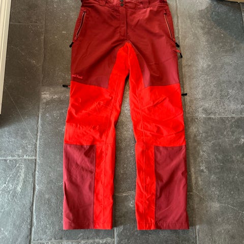 Sondre vadmelsnikkers for dame i størrelse 42. Buksen er i mørk blå med skinndetaljer og justerbare spenner nederst.