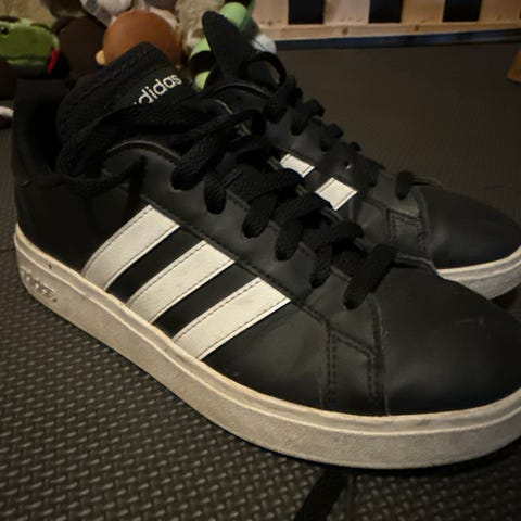 Pent brukte Adidas sneakers joggesko i størrelse 46 1/4. Modellen er lav og har mørk grå overdel med hvite Adidas-striper på sidene. Yttersåle i gummi med mønster for grep. Innersåle er ny original. Lissesnøring foran. Passer til hverdagsbruk og fritid.