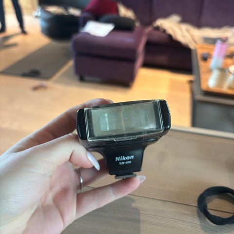 Nikon SL-1 ringlys til kamera. Enheten har integrerte LED-lys i ringform rundt åpningen, og er beregnet for montering foran objektivet for jevn belysning ved nær- og makrofotografering. Drives via ekstern