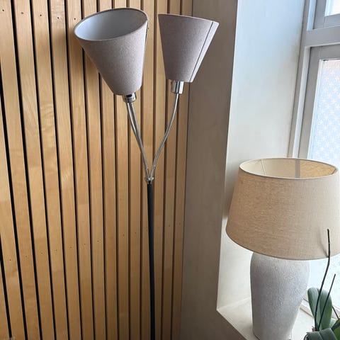Stilren Tivoli-lampe med tre originale skjermer og fine detaljer i gull og svart. Gir et dekorativt og mykt uttrykk i rommet.