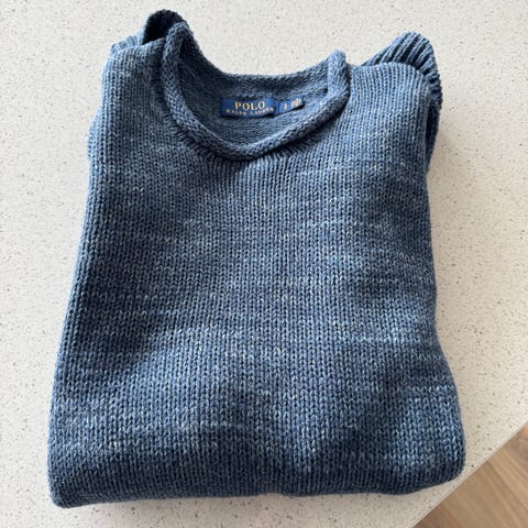Polo Ralph Lauren Iconic Fishermans genser for herre i størrelse S. Genseren er blå og strikket i kasjmir og ull blanding i Aran og flette mønster og har rund hals. Blåfarven er vanskelig å få frem på mobilfoto, derfor har jeg lagt ved bilder fra produsenten. Farven er lysere og mer melert enn mørk blå, nesten mot Indigo, men likevel dempet.