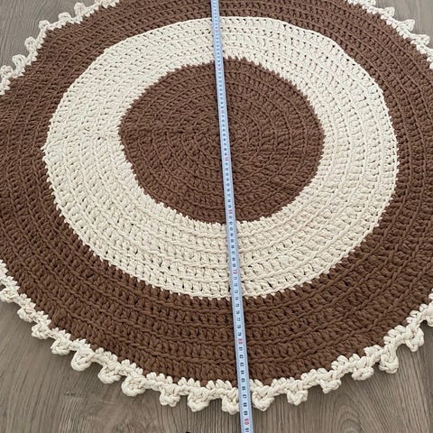 Håndlaget heklet pledd i flerfargede striper og ruter. Pleddet har et geometrisk mønster med midtstilt kvadrat som bygges ut i brede striper i ulike farger, avsluttet med kant i mørk og lys kontrastfarge. Egner seg som teppe i sofa, stol eller på terrasse, og kan også brukes som sengeteppe eller dekorativt over kastestol. Materialet fremstår som garn, nærmere sammensetning er ukjent. Størrelsen virker romslig og dekker godt over en vanlig lenestol eller deler av en sofa.