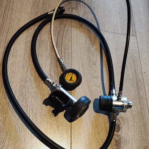 Cressi pustesett dykkerregulator med førstetrinn, hovedtrinn, octopus og manometer.
