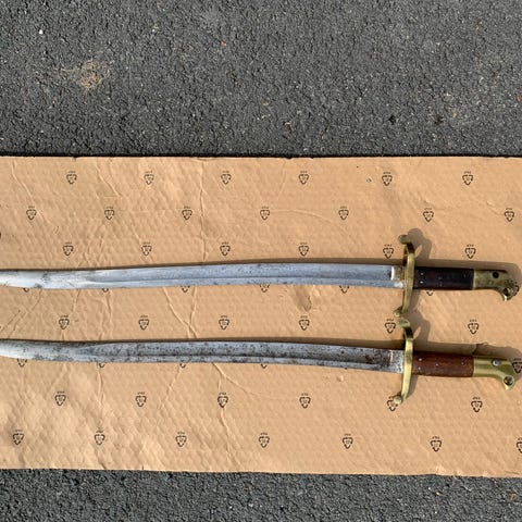 2 stk sverd som pynt selges. Har heng på vegg tidligere. En av dem har brukket en del fra håndtaket. Se bilder. Begge selges samlet. Mål er 100cm lange. Kan sendes med postnord for 130kr