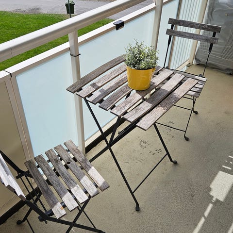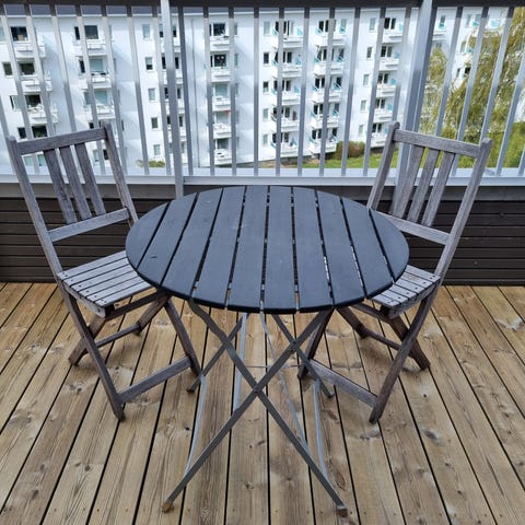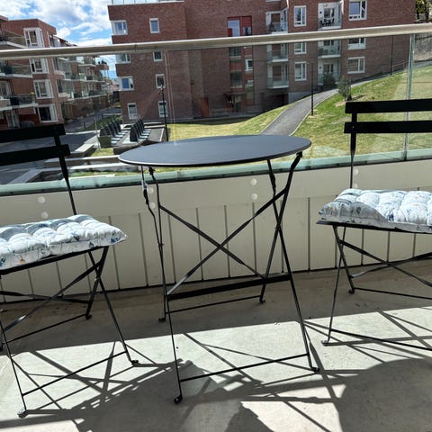 Balkongsett fra IKEA med sammenleggbart bord og to stoler i tre og metall. Egnet for bruk på balkong, terrasse eller liten uteplass.