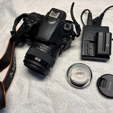 Selger min flotte Sony a58 speilreflekskamera, den har to linser. Ene er den orginale som fulgte med 18-55mm mens det andre kjøpte jeg samtidig som jeg kjøpte kameraet som har en zoom på 75-300. Det følger med SD-kort, lader og batteri. Jeg har også orginal esken på kameraet. Den følger også med en slik u8000 som er et av markedets beste kamera støtter. Jeg har bare mista den adapteren som går fra støtte til kamera men det er ikke vanskelig å få tak i.