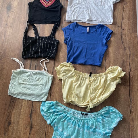 Toppene er i str XS til S, og fra merker som Bershka, Stradivarius, H&M, Bikbok, New Yorker og Shein.