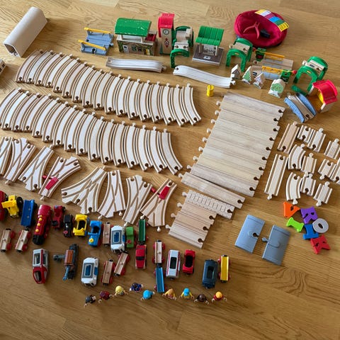 BRIO togbane med dinosaurtema treleker. Sett med buede og rette tretogskinner, tog med vogner, broer og tunneler med vulkan- og dinosaurmotiv. Inkluderer flere små trefigurer som trær, dyr, steiner og andre elementer til lekemiljøet. Passer til lek med BRIO-tog og andre kompatible tretogbaner, og kan kombineres med andre sett for å bygge større baner og landskap.