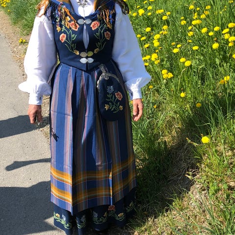 Selger min flotte blå Nordlandsbunad med tilhørende linskjorte, sjal, forkle og bunadsveske.