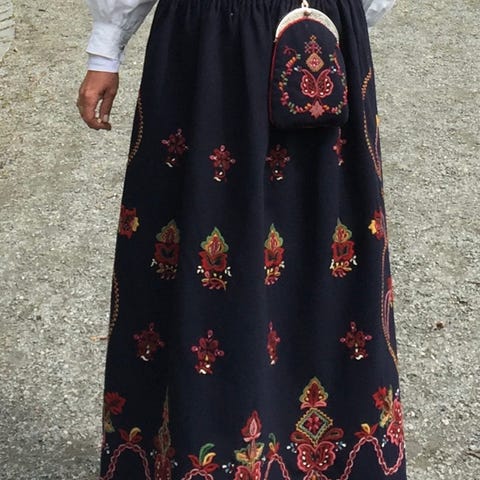 Ullstoffet til bunaden og linstoffet til skjorten er kjøpt hos Husfliden i Bodø. Begge er brodert og montert av flinke, erfarne sydamer her i landet. Renset i 2025.
