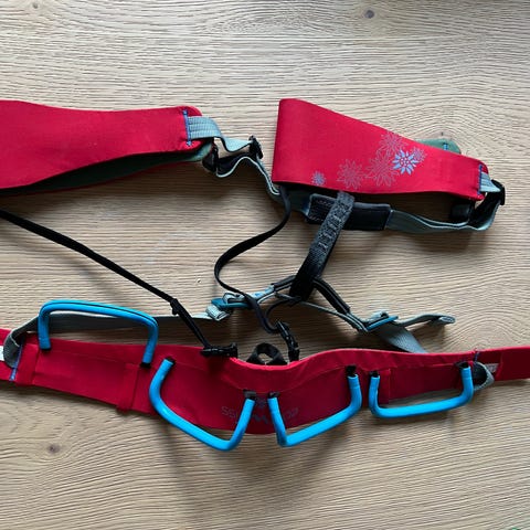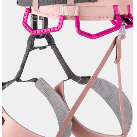 Mammut Venus 4.0 klatresele for dame i størrelse S. Selen er blå med røde og rosa detaljer og har justerbare lårløkker og hoftebelte med polstring. Modellen har flere utstyrsløkker for feste av sikringsutstyr. Egnet til klatring og fjellklatring der det kreves komfortabel og justerbar sele tilpasset damefasong.
