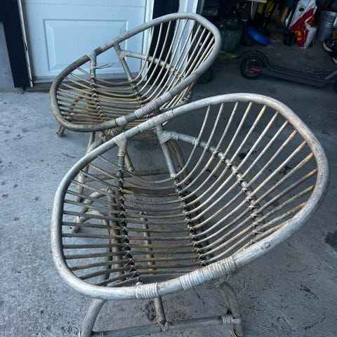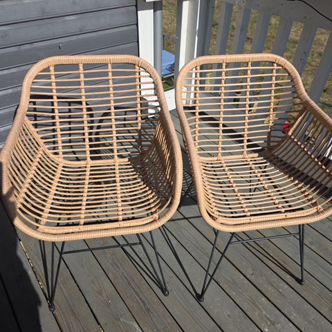 Flettede loungestoler med hvit metallramme. Stolene har høy rygg og armlener, og setet er utformet i flettet materiale som gir luftig sittekomfort. Understell i metall med skrå ben gir god stabilitet. Egner seg som sittemøbler på terrasse, balkong, hage eller inne i oppholdsrom.