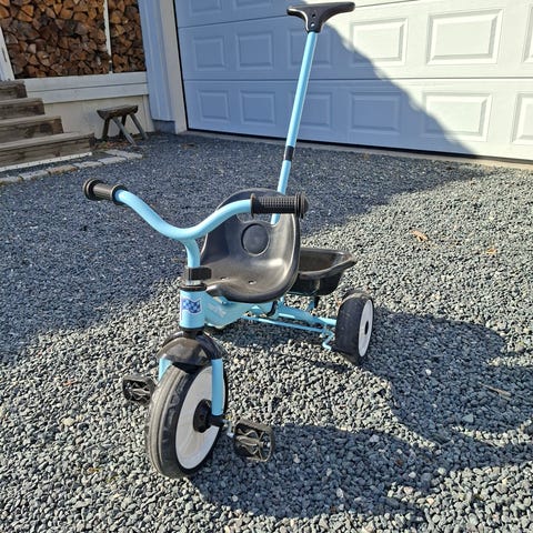 Nordic Hoj trehjulssykkel med 10" hjul i lys blå farge. Trehjulssykkelen har pedaler på forhjulet, plastsete med rygg og håndtak, samt styrepinne bak for voksen. Bak er det en liten lastebøtte. Egnet som barnesykkel/trehjulssykkel for mindre barn som skal øve balanse og tråkking.