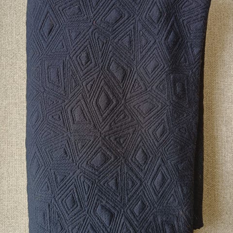 Jacquard i mørk rød barokkstil med frøskaller Stoffstykke, blankt blomstermønster. Stoffet har et tydelig mønster i ton-i-ton nyanser av rødt. Materiale ifølge lappen: blanding av polyester og bomull. Egner seg til søm av gardiner eller annen enkel interiørtekstilsying der et kraftigere, dekorativt stoff ønskes.