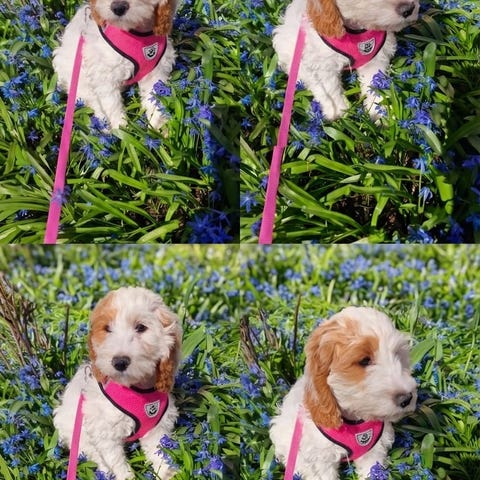Vi har ledige cockapoo F1 valper, med fargen golden rød og sort/tan, fra et kull på 4 friske og fine valper! Mor er engelsk cocker spaniel, fargen sort/tan, og far er en liten mellompuddel, golden i fargen. Mor og far har gjennomgått helseundersøkelser som HD/AD rtg, øyelysing og kontroll for patellasykdommer. Foreldrene er glade hunder, med et meget godt gemytt, og valpene sosialiseres med både hunder og barn! Valpene ble født 28.februar - 26, og er leveringsklare i starten av mai. Dette er noen skikkelige sjarmtroll, som elsker kos og oppmerksomhet ❤️ Valpene leveres med helseattest, vaksinert og chippet, samt en liten utstyrspakke.