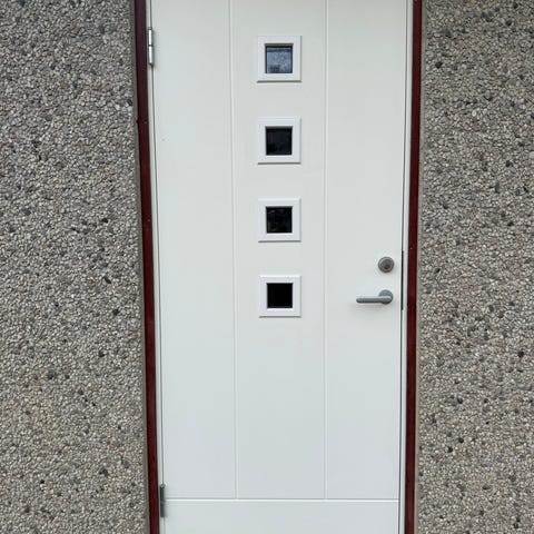 Ytterdør i tre med brun overflate og tilhørende karm. Døren har utsparing for lås og dørhåndtak, samt kikkehull. Passer som ytterdør til bolig, bod eller garasje der det er behov for en enkel tredør med karm. Mål og hengsling bør kontrolleres ved henting eller montering.