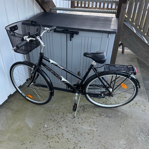 Nå er sykkelen prøvd. Gira virker ikke. God å sykle på. God bremse. Kjededekslet er knekt så derfor er det tapet.