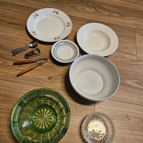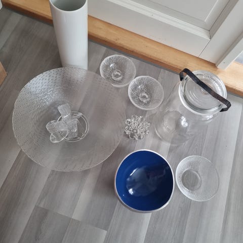 Diverse glassboller, telysholdere, , keramikk syltetøykrukke + 3 støpejernslysestaker. Gis bort samlet. Må hentes.