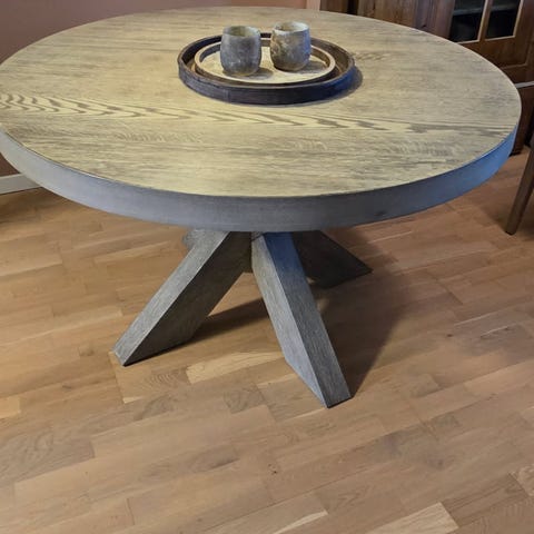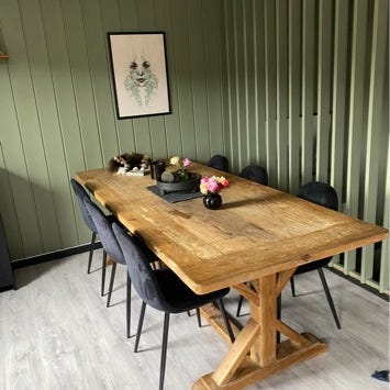 Artwood spisebord, 220 cm x 100 cm x ca 78 cm høyt, bordplate er laget av gammel låvedør, røff stil, må gjerne sees.
