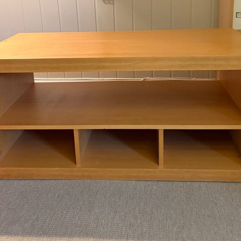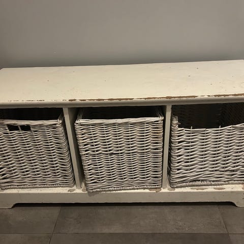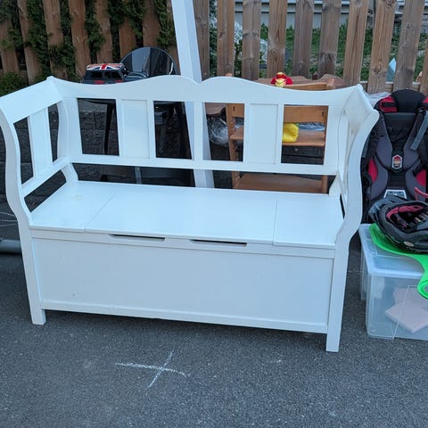 Brukt oppbevaringsbenk. To små skader på hver sin side av fronten. Må hentes før onsdag 1. april. Blir kastet etter det.