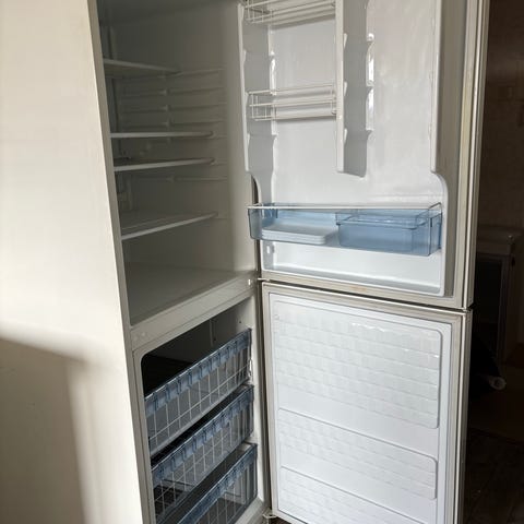 Kombiskapet har kjøledel øverst med flere justerbare glasshyller, grønnsaksskuff og dørhyller for oppbevaring av mindre varer. Nederst er det frysedel med skuffer for organisering av frossenmat. Innredningen er utformet for å gi oversiktlig lagring av matvarer i både kjøle- og frysedel.