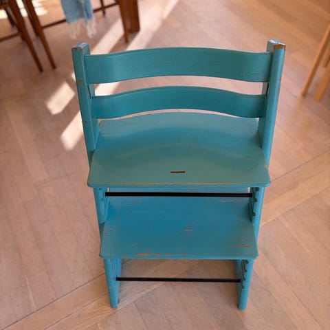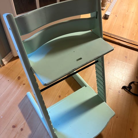 Stokke Tripp Trapp høy barnestol i turkis malt tre. Stolen har justerbart sete og fotbrett som kan flyttes i høyden etter barnets størrelse. Klassisk Tripp Trapp-konstruksjon med stabil ramme og tverrstang foran. Egnet som spise- og sitteplass ved bord for barn, med mulighet for å tilpasses etter hvert som barnet vokser.