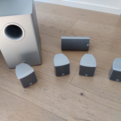 Logitech høyttalersett med flere satellitthøyttalere. Høyttalerne er små og beregnet for bruk som del av et flerkanals anlegg, for eksempel til PC eller hjemmekino. Tilkobling skjer via fjærklemmer for høyttalerkabel på baksiden av hver høyttaler. Høyttalerne står på faste bordstativer i sølvfarge.